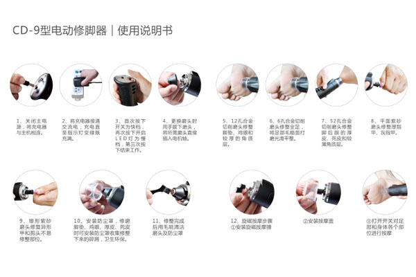 本產(chǎn)品適用于腳墊,腳雞眼,灰指甲,異形甲,厚皮,死皮,干裂角質(zhì)層人群。兼具懸磁按摩功能,該產(chǎn)品科學巧妙地運用了力度,角度,速度,方向等的有機結(jié)合,修整時不會損傷正常皮膚,且無需泡腳。本產(chǎn)品的發(fā)明為廣大腳疾患者提供了一套安全方便的修腳工具。擁有它,相當于把一位高級修腳師請回家。